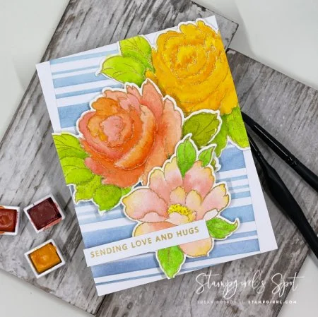 I used the 24-pan Watercolor set and I tried to keep the colors complementary, using shades of yellow, peach, and pink. I really took my time and built up the colors and the layers to give the illusion of shape and shadowing. It was the first time I’ve used the Altenew watercolor brushes and I LOVED them! I think the best part is the flat grips, they are much more comfortable than a regular round-handled brush, and the grips keep the brushes from rolling off your desk! I was really pleased with how the flowers turned out.